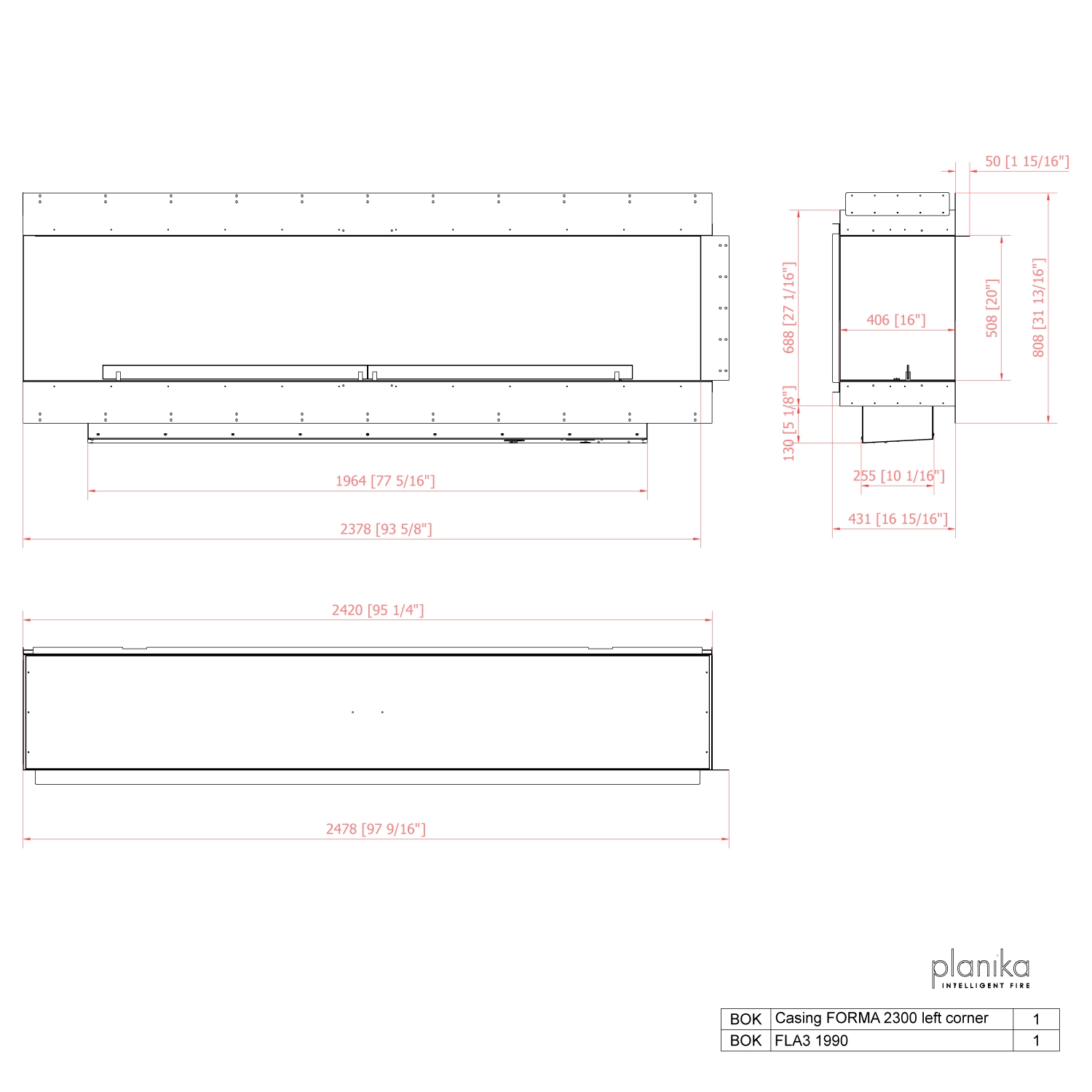 Planika Forma 2300 Left Corner is made of galvanised steel, which is powder-coated black, and tempered glass. This gives the fireplace a neutral and timeless design that will last for many years. The glass not only looks good, but also protects the flames from draughts and small gusts of wind, which contributes to a more stable flame.