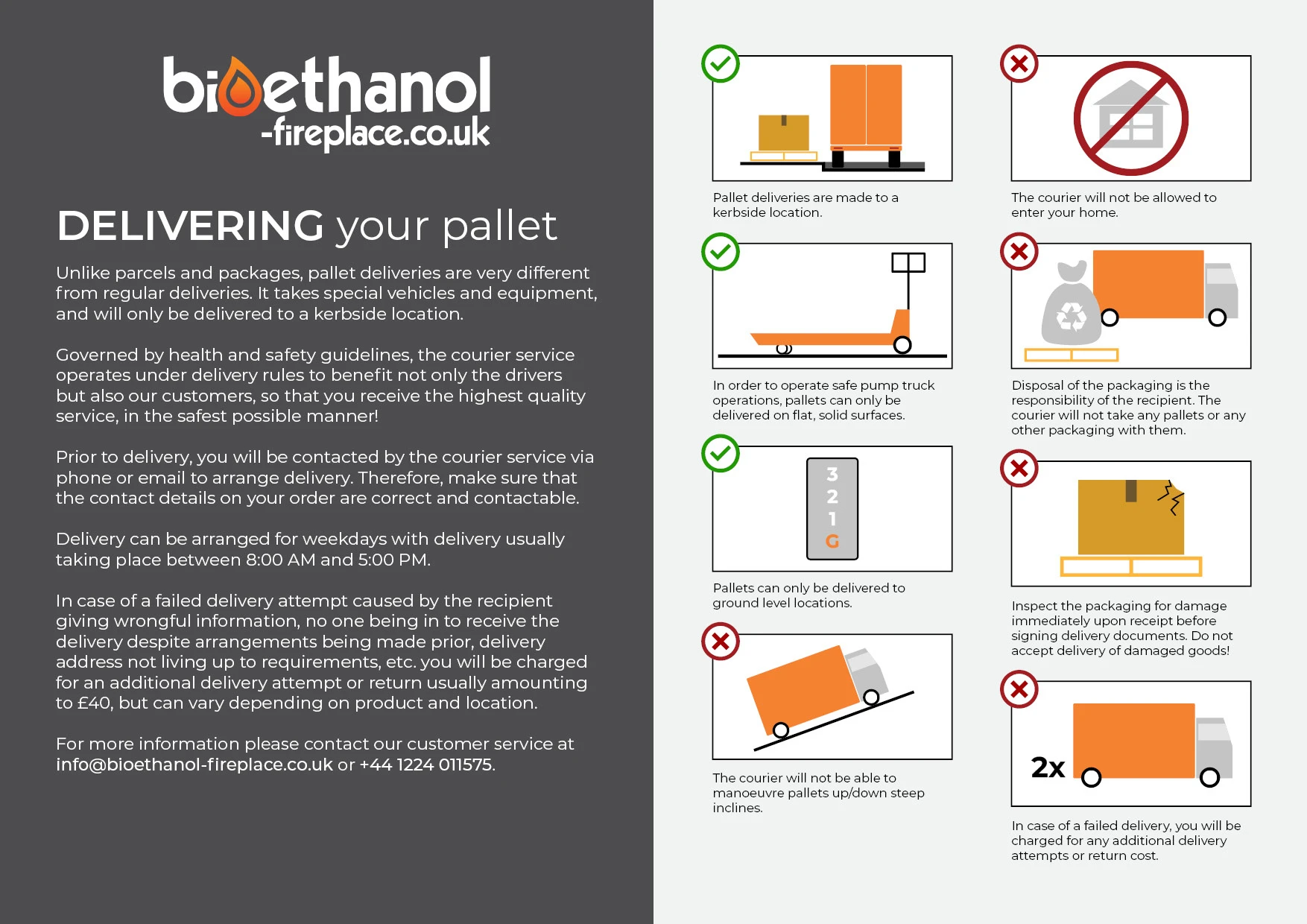 At Bioethanol-fireplace.co.uk we send many of our orders as pallet freight. We do this to avoid transport damage and because large fireplaces cannot be sent as ordinary parcel post. As a customer, you should therefore be aware that your order may be sent as a pallet delivery.