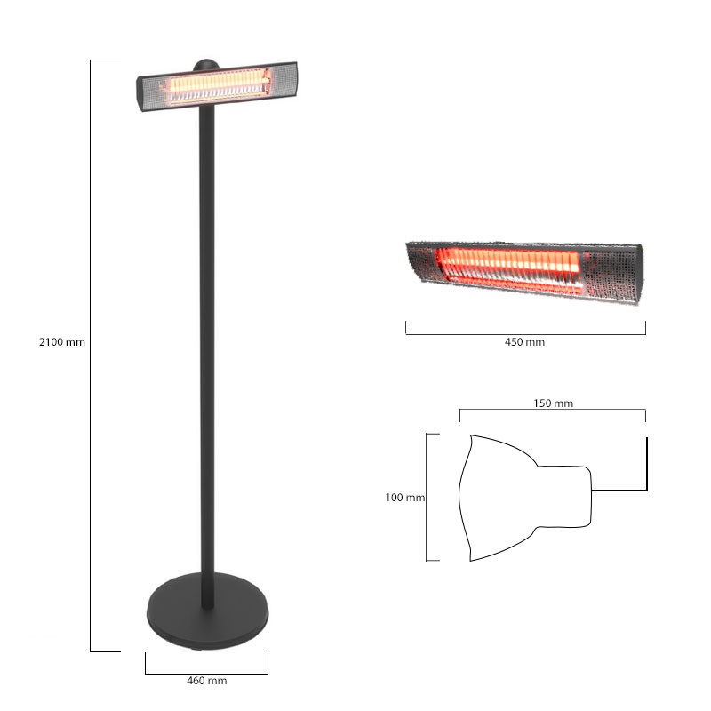 Efficient patio heater designed for the floor. This heater is equipped with short-wave infrared halogen tubes, which provide a good heat that can heat an area of 4-5 square meters.